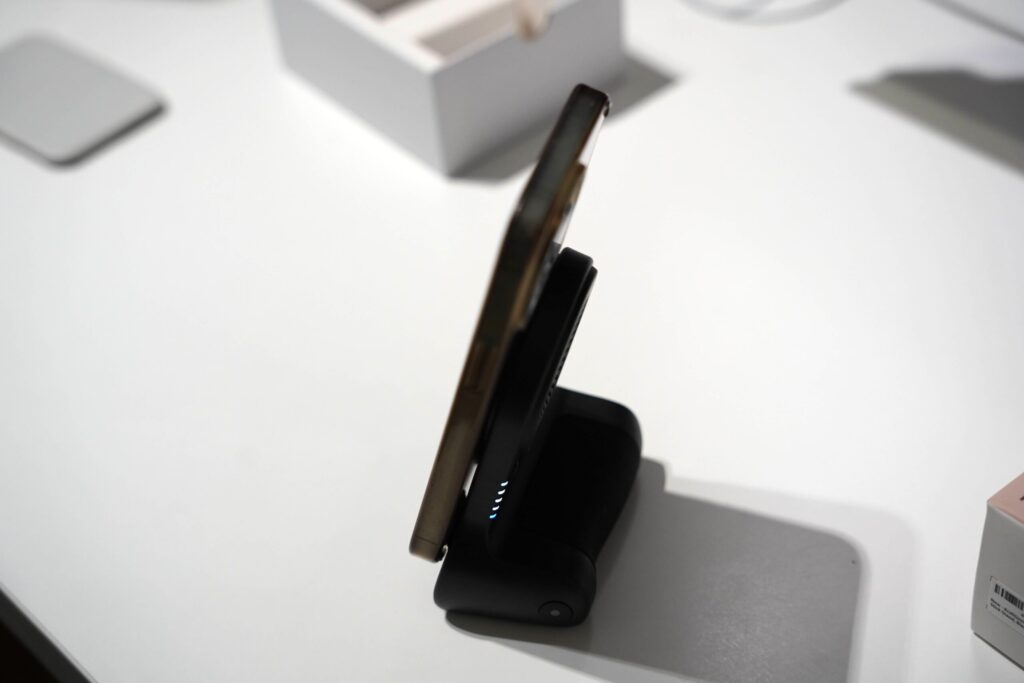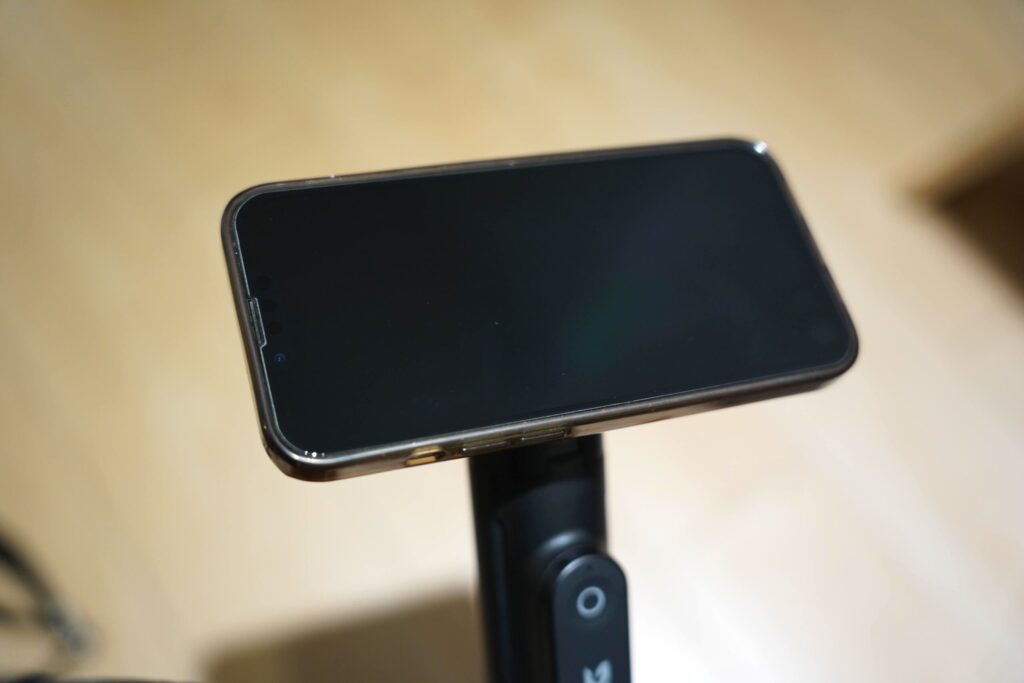 2つ目の特徴がマグネットでスマホを固定する点。よくある三脚はクランプでスマホを挟んで固定するものが多いけど、JustTap Tripodはマグネットで瞬時にスマホを固定できる。(MagSafeTMや金属リング、金属リング付きケースに対応)