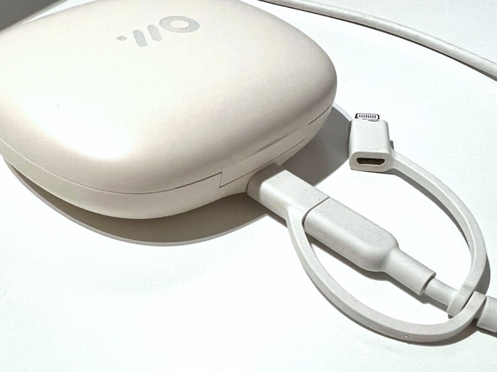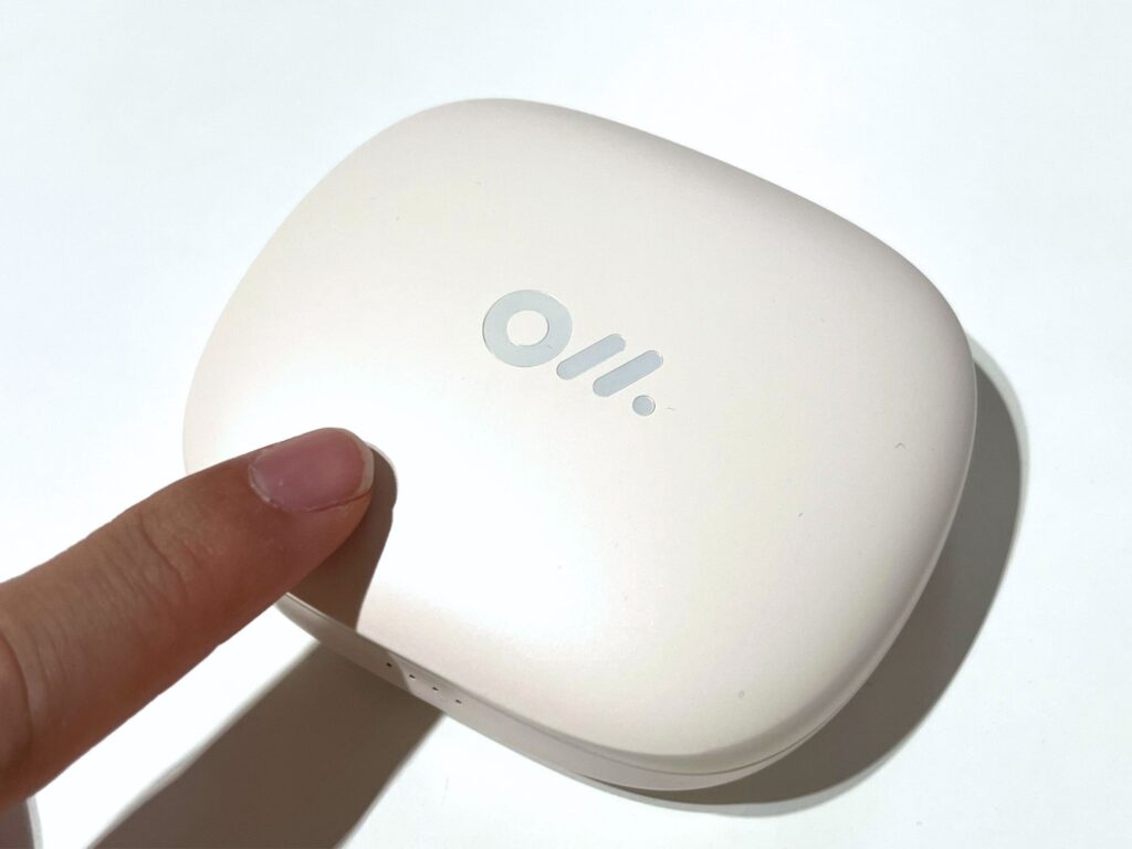 一方の充電ケースはイヤホン本体とは違ってマットな質感になっているのと、ぷくっとした形状でかわいい雰囲気になっている。カバンの中に入っているとテンション上がるやつ。ちなみに私が持っているのはホワイトなんだけど、ケースはグレージュっぽい色合いになっている。